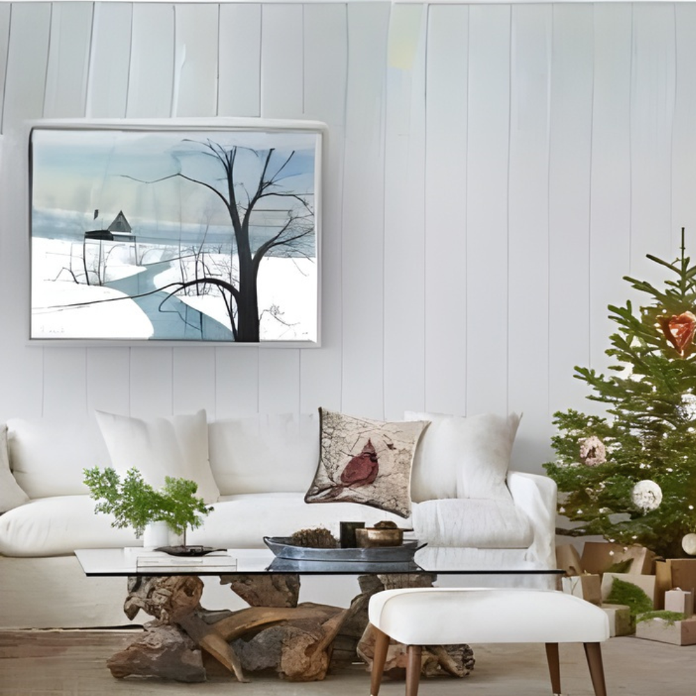 Christmas Ornaments Home Decor offers a refined approach to holiday styling by combining understated seasonal accents with timeless fine art. In this living space, soft white furnishings and natural wood elements provide a calm foundation, allowing the artwork Blessed Peace to anchor the room with quiet winter beauty. The snowy landscape and gentle blues echo the season without overwhelming the space, making it ideal for those who prefer subtle, elegant holiday décor.