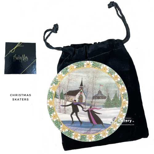 Christmas Skaters Ornament by P. Buckley Moss captures the joyful elegance of winter with a rare and timeless scene. This numbered, limited edition porcelain ornament portrays a couple gracefully gliding across a frozen pond, hand in hand, framed by a peaceful snow-covered village. The church and gazebo in the background evoke a sense of tradition, faith, and community, making this piece a heartwarming addition to any holiday collection.