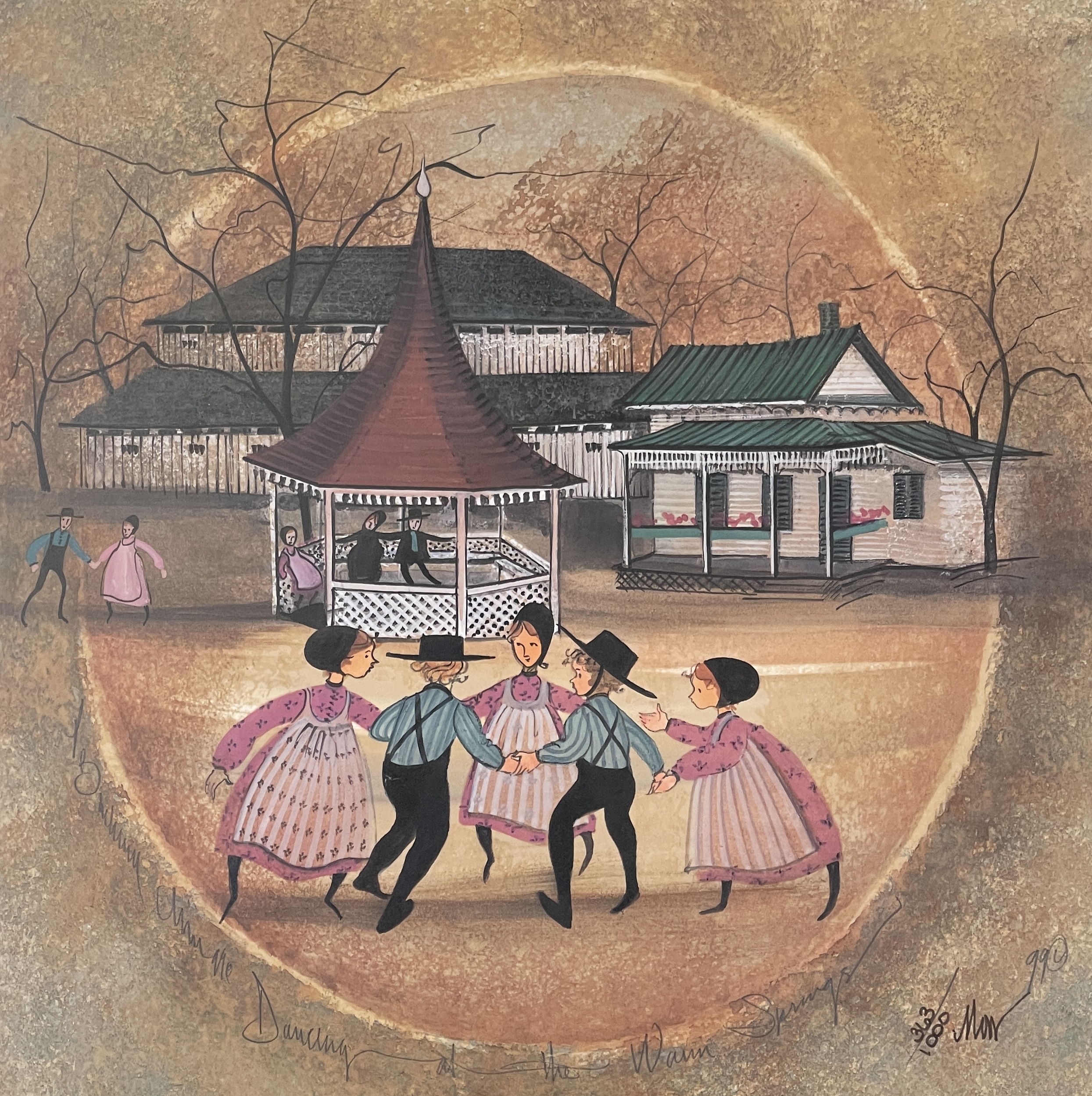 In Dancing At The Warm Springs, Moss uses warm amber, soft browns, and muted greens to create depth and nostalgia. The glowing circular composition draws the viewer inward, focusing attention on the dancers while softly framing the historic buildings behind them.