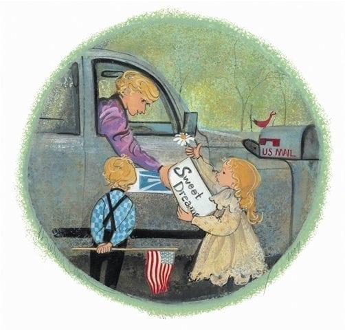 In Delivering Sweet Dreams, a kind mail carrier leans from a softly rendered delivery truck window, reaching down to accept a handmade card labeled “Sweet Dreams.” A young girl in a flowing cream dress stands on tiptoe, stretching upward to present her carefully crafted creation. In her hand, she also holds a simple daisy—an added touch of sweetness and sincerity. Beside her stands a young boy dressed in suspenders and a blue patterned shirt, holding a small American flag that gently rests against the ground.