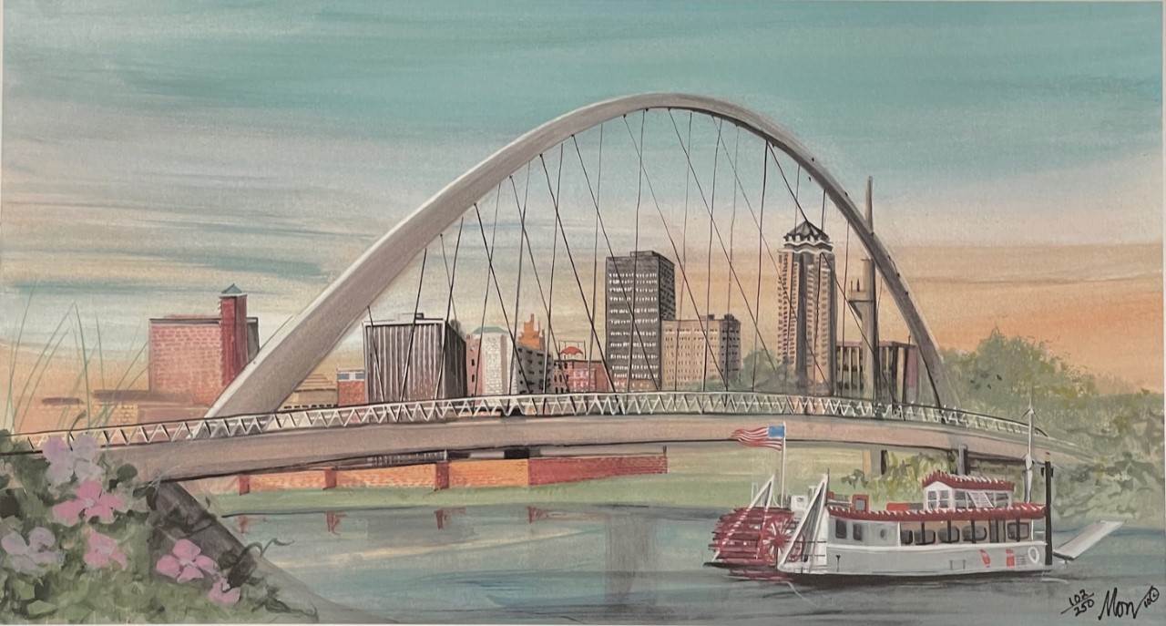 Bridges often symbolize connection and unity, and here the sweeping arch becomes a metaphor for linking community, progress, and tradition. The inclusion of the riverboat adds a touch of nostalgia, reminding viewers of the historical importance of waterways in shaping Midwestern cities.