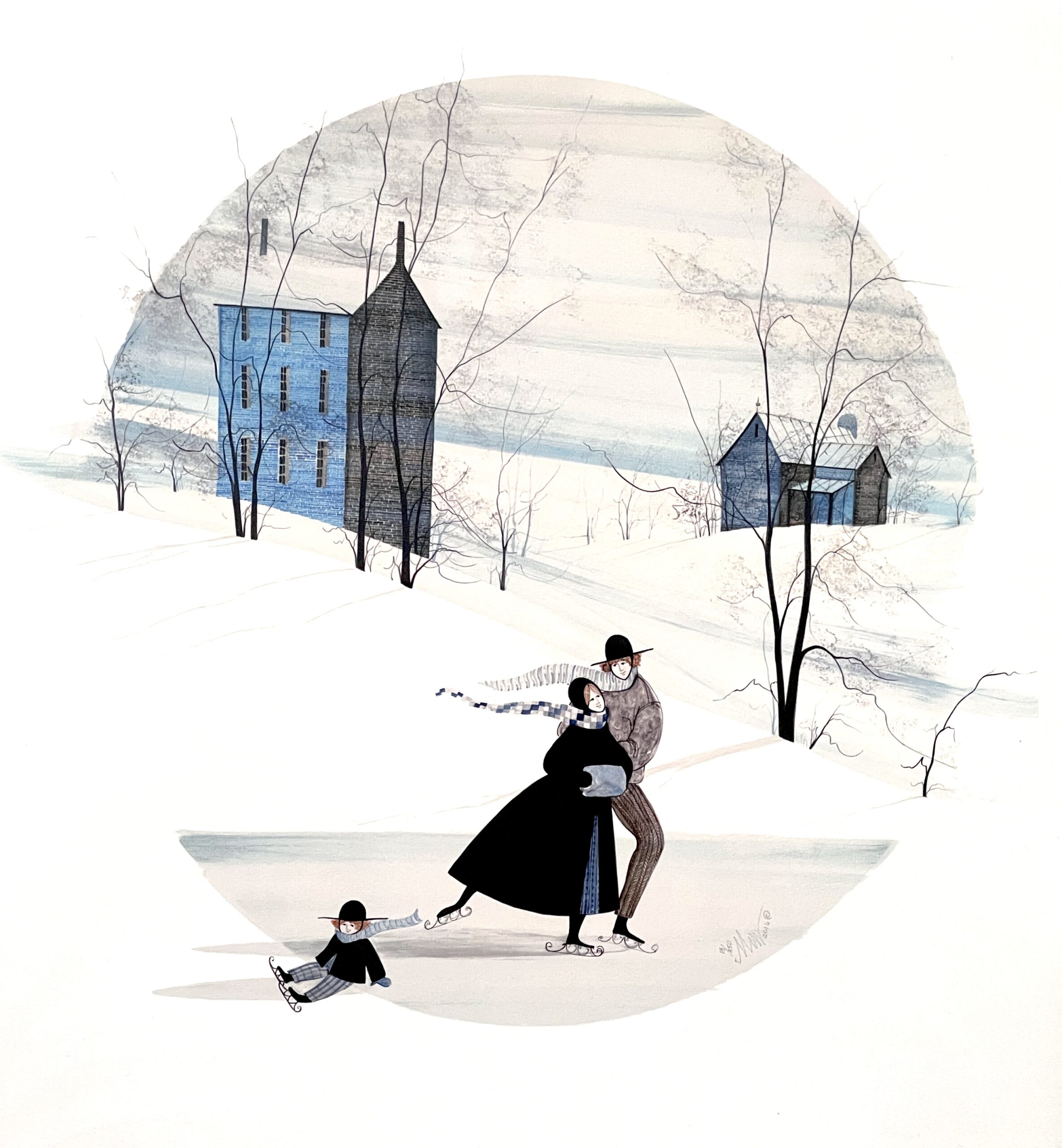 Rendered in Moss’s signature folk-art style, First Lesson features elongated figures, gentle curves, and a soft winter palette. Pale blues, warm grays, creamy whites, and subtle charcoal tones work together to create a calm, harmonious scene. The parents’ darker clothing anchors the composition, while the child’s smaller figure adds visual tenderness and emotional focus.