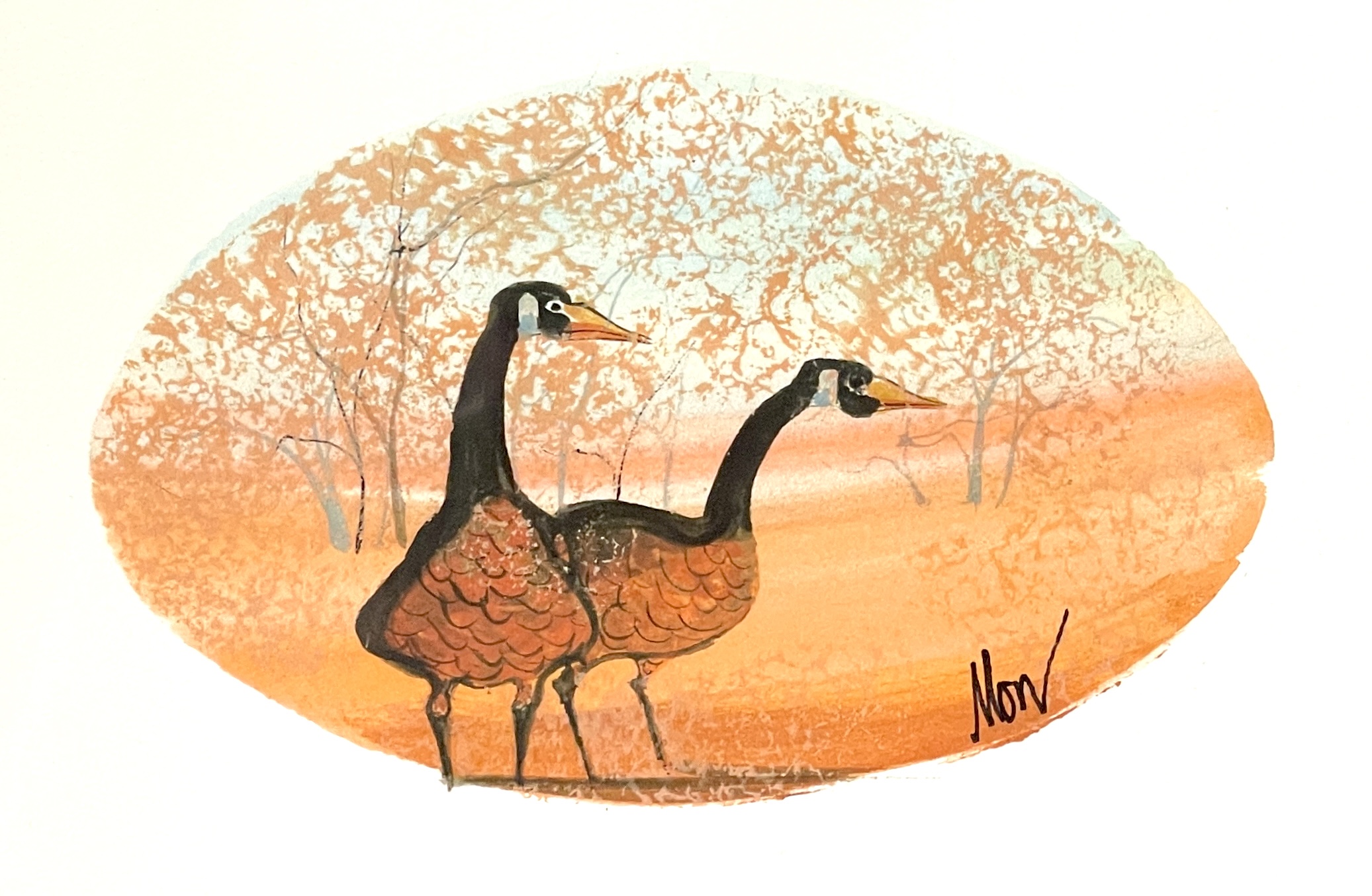 The giclée process enhances the layered textures and subtle color transitions, preserving the painterly quality of Moss’s original work. The oval composition further reinforces intimacy, naturally drawing the viewer’s focus inward toward the pair of geese. This framing choice enhances the sense of closeness and unity that defines the piece.