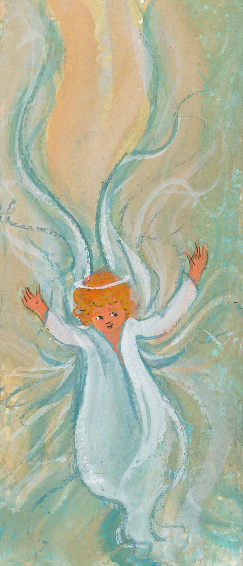 As a giclée, Hope Eternal preserves every nuance of Moss’s original watercolor textures and brushwork. The layered washes of turquoise, gold, and cream create a luminous backdrop, while the angel’s white gown and halo radiate purity and light. Moss’s signature elongated lines and flowing curves give the figure both movement and serenity, making the composition feel alive with spiritual energy.