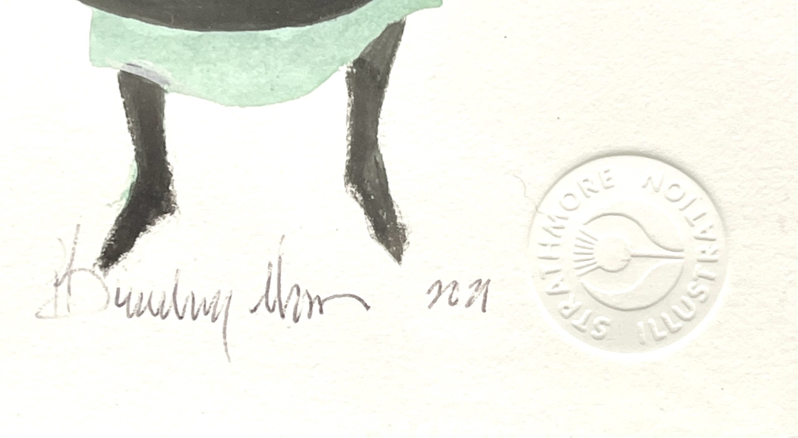 Hand Signed: “P Buckley Moss 2021” – Center bottom under girl’s feet with an embossed Strathmore Illustration seal to the right.