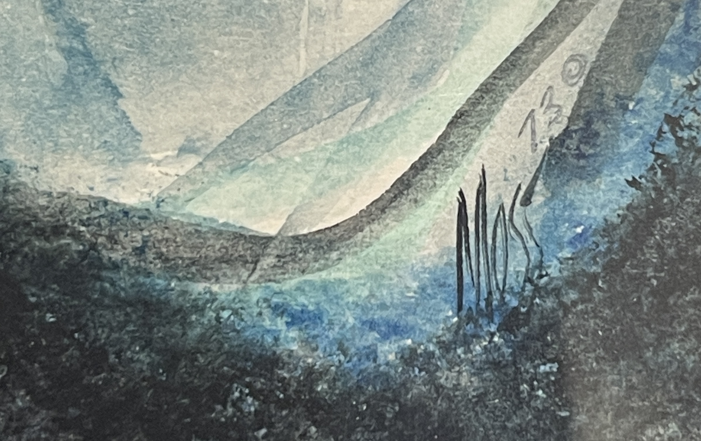 The use of watercolor gives the painting a luminous, translucent quality. Each brushstroke feels intentional, with washes of blue symbolizing both peace and protection. Because this piece is an original, the artist’s hand is fully present—visible in the layers of pigment, the delicate ink outlines, and the personal signature dated 1973.