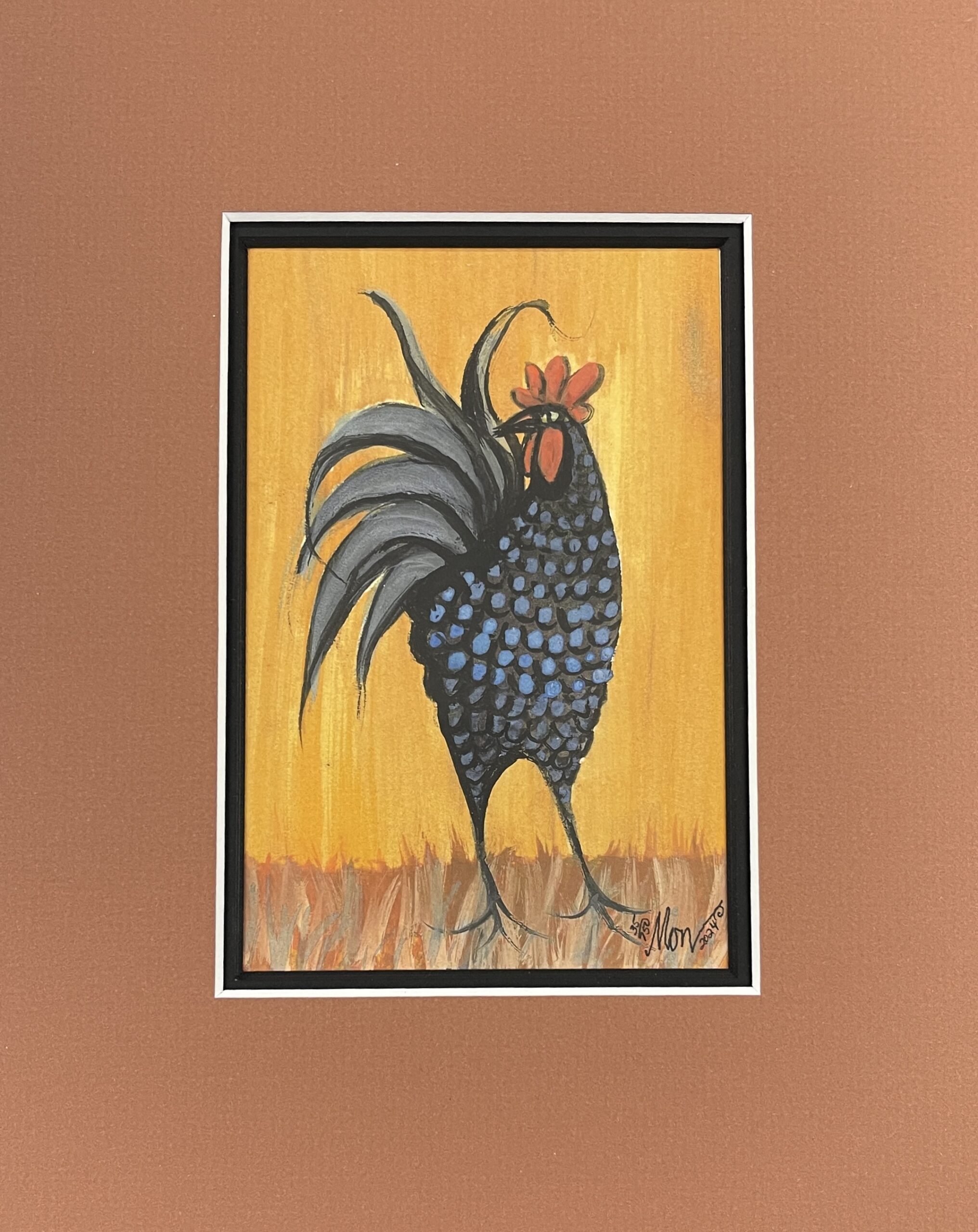 Moss’s folk-modern watercolor and ink technique blends expressive simplicity with emotional depth. The rooster’s sleek lines and patterned plumage reflect her distinctive touch—each stroke intentional, balanced, and filled with character. The interplay between deep black and blue tones and the brilliant sunrise gold background suggests renewal, courage, and the start of a new day.
