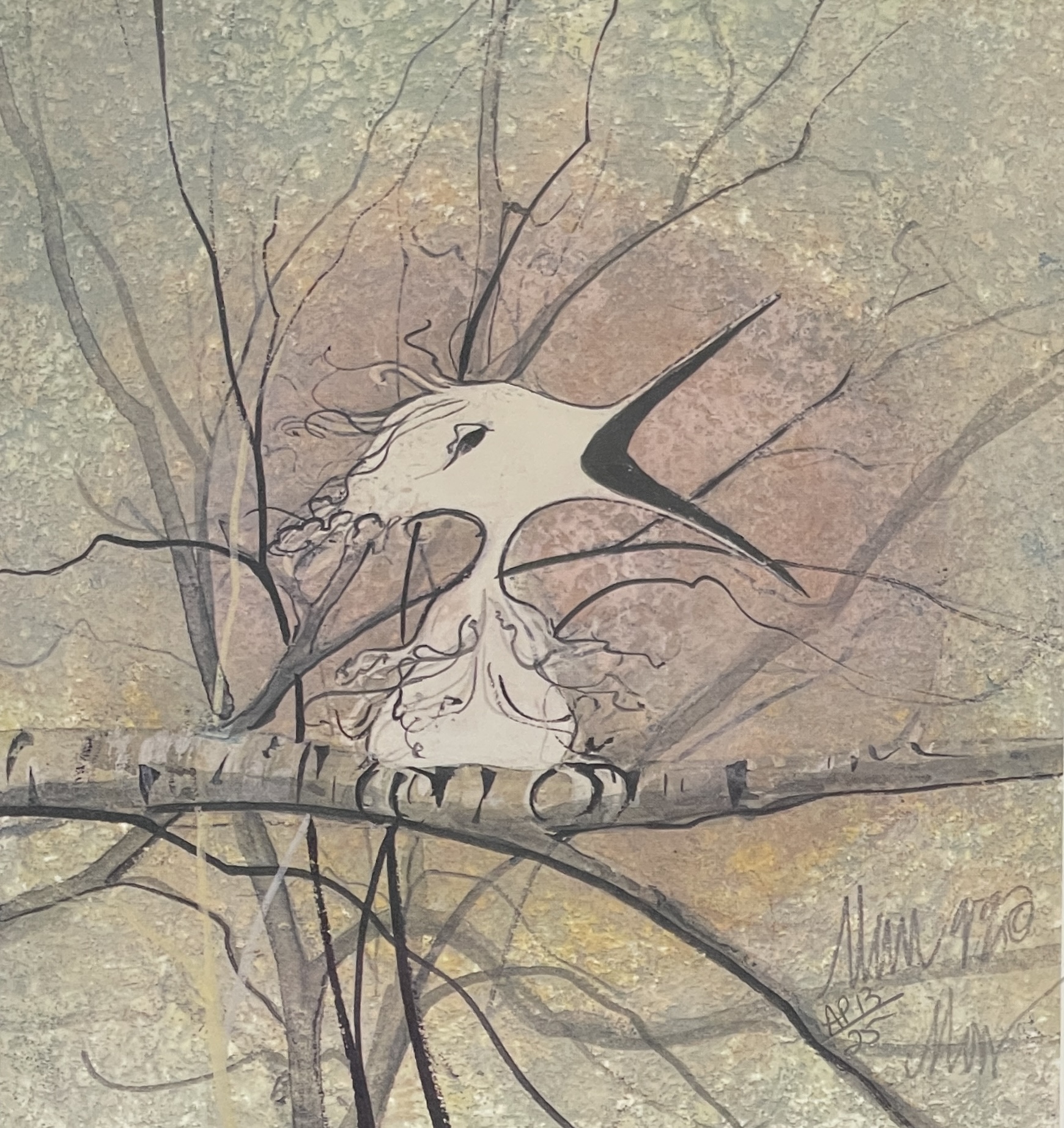 The neutral palette gives the piece a warm, vintage quality. Moss’s layered textures in the background create depth without overwhelming the central subject. Fine linework defines the branches, giving the composition movement and balance, while the softly blended backdrop enhances the bird’s delicate silhouette.