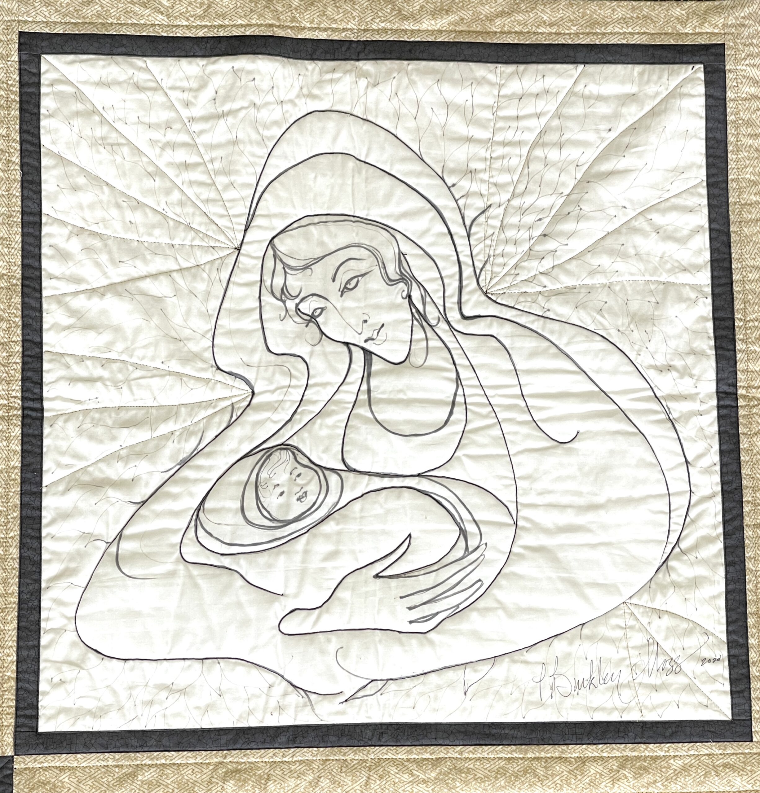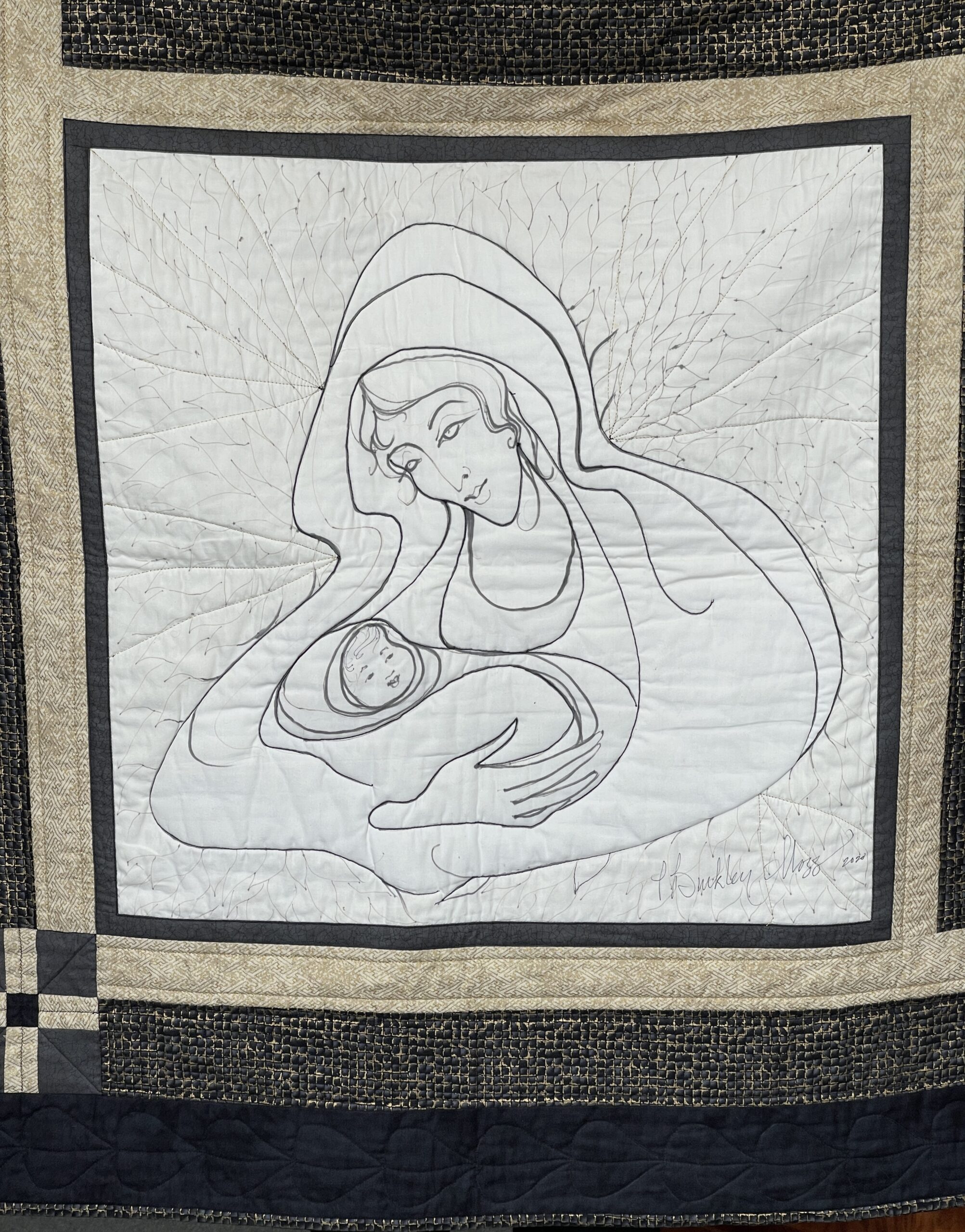 This remarkable piece unites two beloved art forms — fine art and quilting. Moss’s painted textile is bordered by meticulously stitched panels in muted tones of navy, cream, and gold, each quilted with soft, undulating lines that mirror the tenderness of the central image. The result is a visual hymn to motherhood, faith, and the quiet power of compassion.
