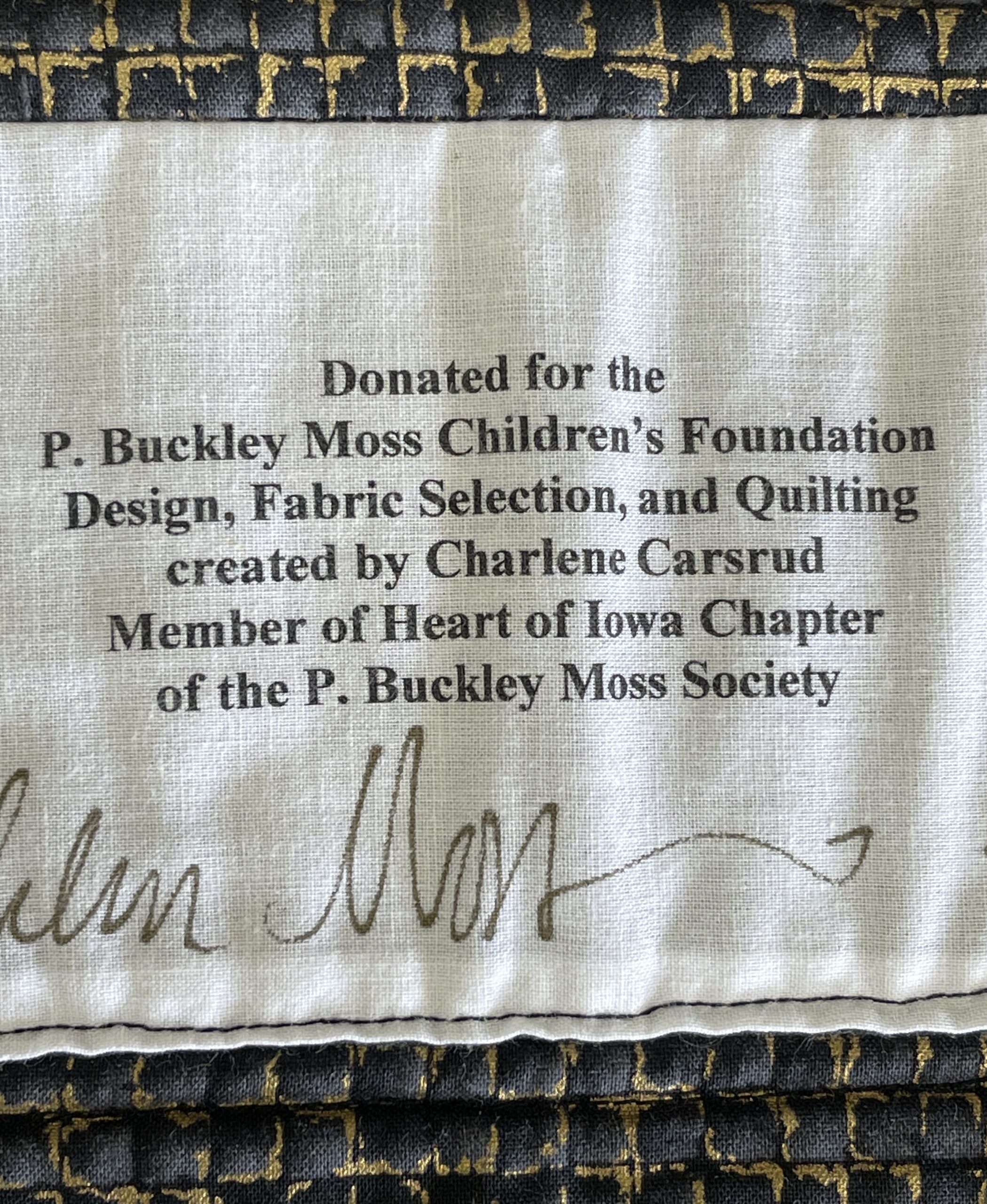 Every detail reflects the heart of community artistry: P. Buckley Moss hand-signed the piece, and the quilt designer also signed it, transforming it into a dual-signed collaboration. A patch on the back documents its authenticity and origin — part of Moss’s ongoing commitment to giving back through art.