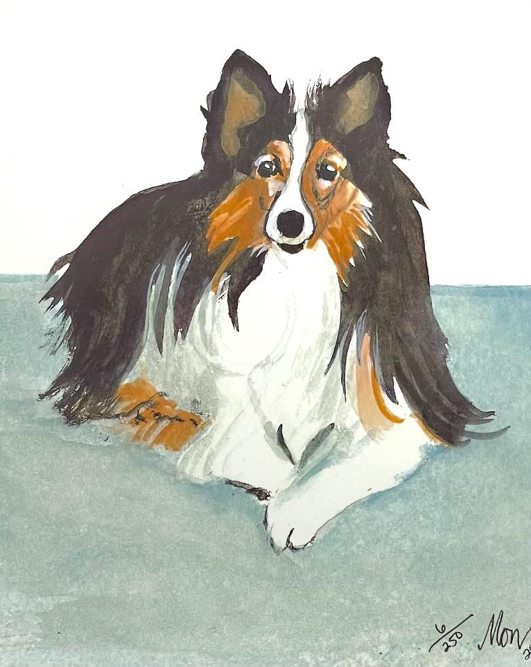 Moss uses expressive brushstrokes and rich colors to emphasize the Sheltie’s flowing fur and distinctive markings. The contrast between the dark outer coat and the luminous whites and golds creates depth and vibrancy. The giclée process preserves the texture and detail of Moss’s original work, while her personal signature and numbering ensure authenticity and collectible value.