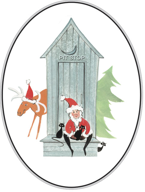 Just to the side of the outhouse, a friendly reindeer wearing a festive Santa hat peeks around the corner, as if concerned about Santa’s delay or simply amused by the situation. The expressive tilt of the reindeer’s head gives the scene a playful tone and highlights Moss’s distinctive ability to animate her subjects with subtle gesture and line. Standing behind them, a simple evergreen tree anchors the composition in a seasonal setting, its soft shape and muted greens offering a gentle contrast to the brighter reds of Santa’s coat and hat. The outhouse itself, labeled “PIT STOP,” becomes a humorous focal point, reminding viewers that even magical figures sometimes need a moment to rest. With its oval frame and clean white background, the ornament feels crisp, cheerful, and perfectly suited for holiday display.