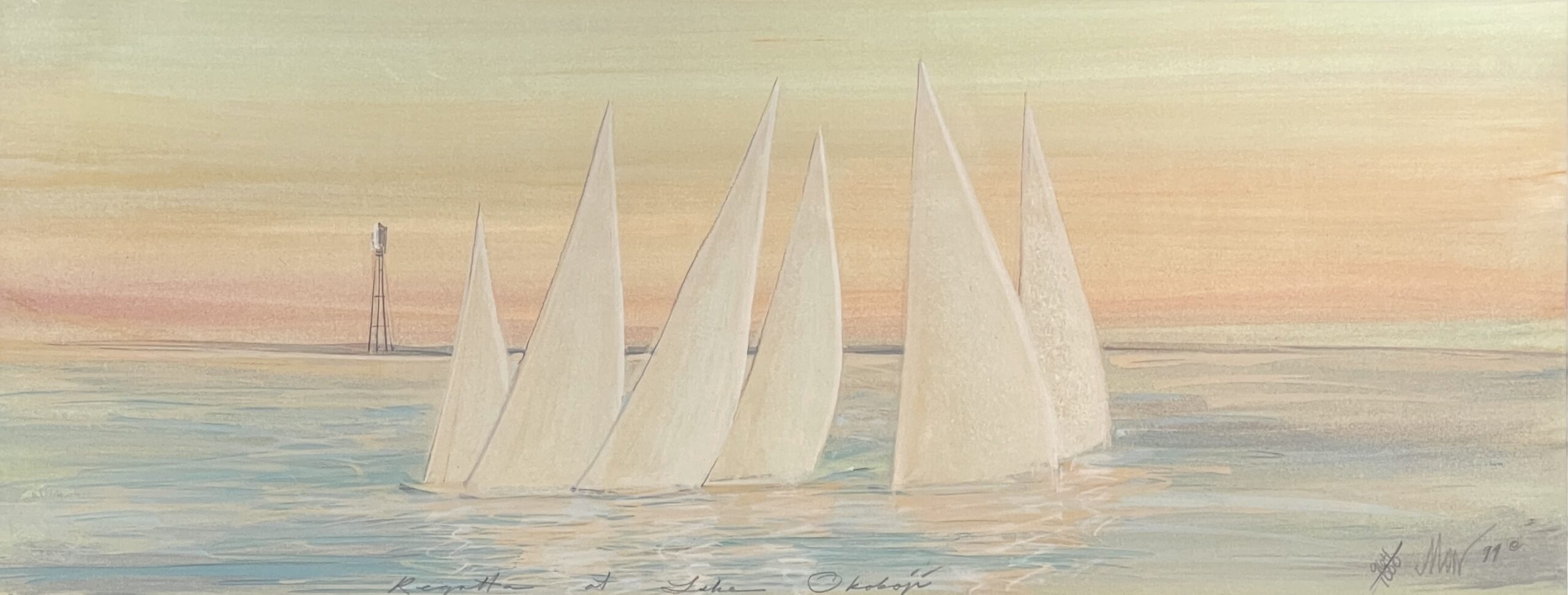 Regatta at Lake Okoboji portrays the sailboats which frequent the waters of Lake Okoboji, Okoboji, Iowa. Lake Okoboji is one of only three blue water lakes in the world.