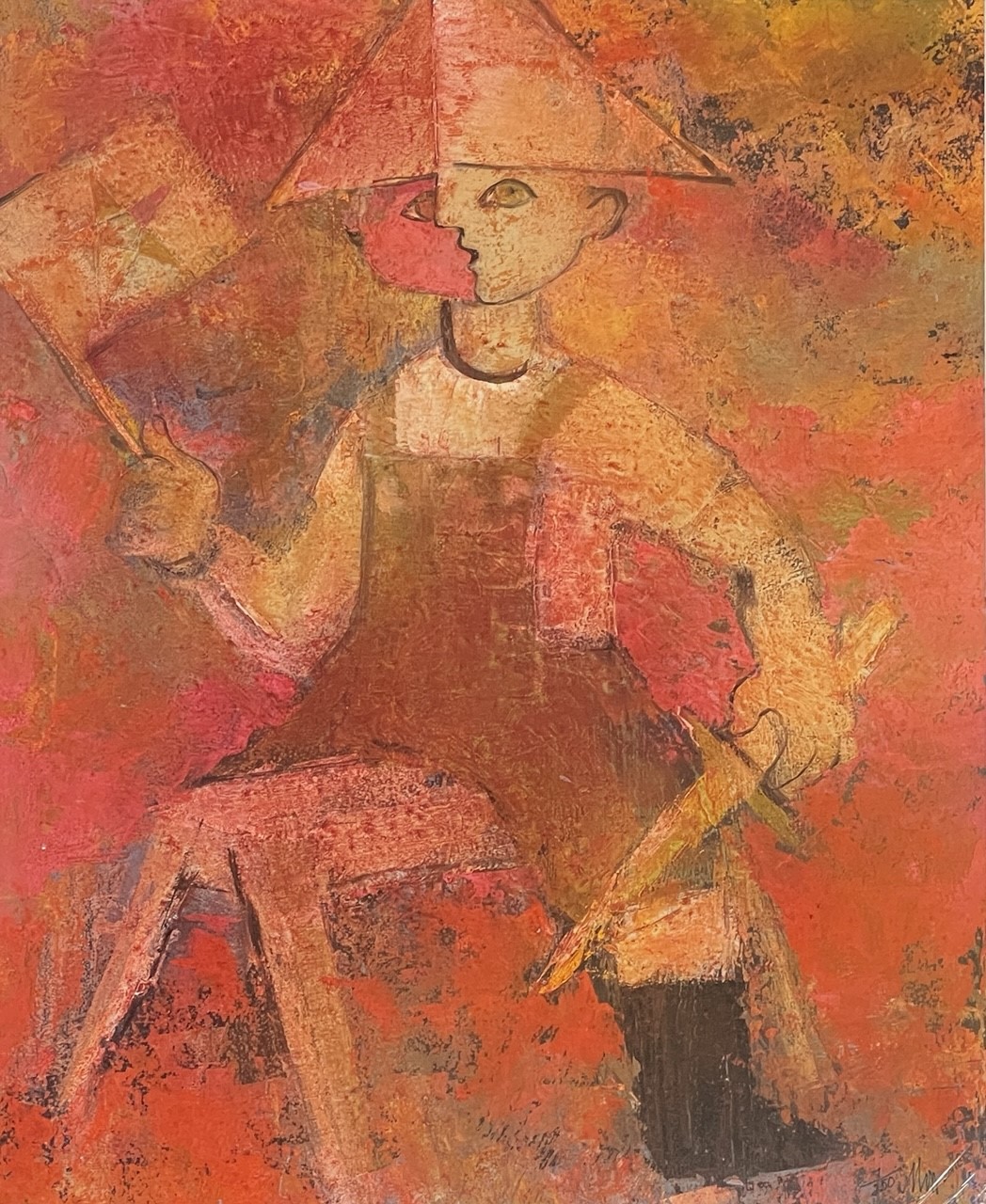 The subject is striking: a figure that appears simultaneously playful and unsettling. Wearing a paper hat and holding a flag, the “soldier” evokes childhood innocence and games of make-believe, but the angular stylization and the figure’s fractured, mask-like face introduce a deeper, more ambiguous interpretation. The title Sawhorse Soldier hints at both the child’s toy world and the mechanical, almost puppet-like nature of war. Through this duality, Moss invites viewers to consider the contrast between innocence and violence, play and reality, vulnerability and power.