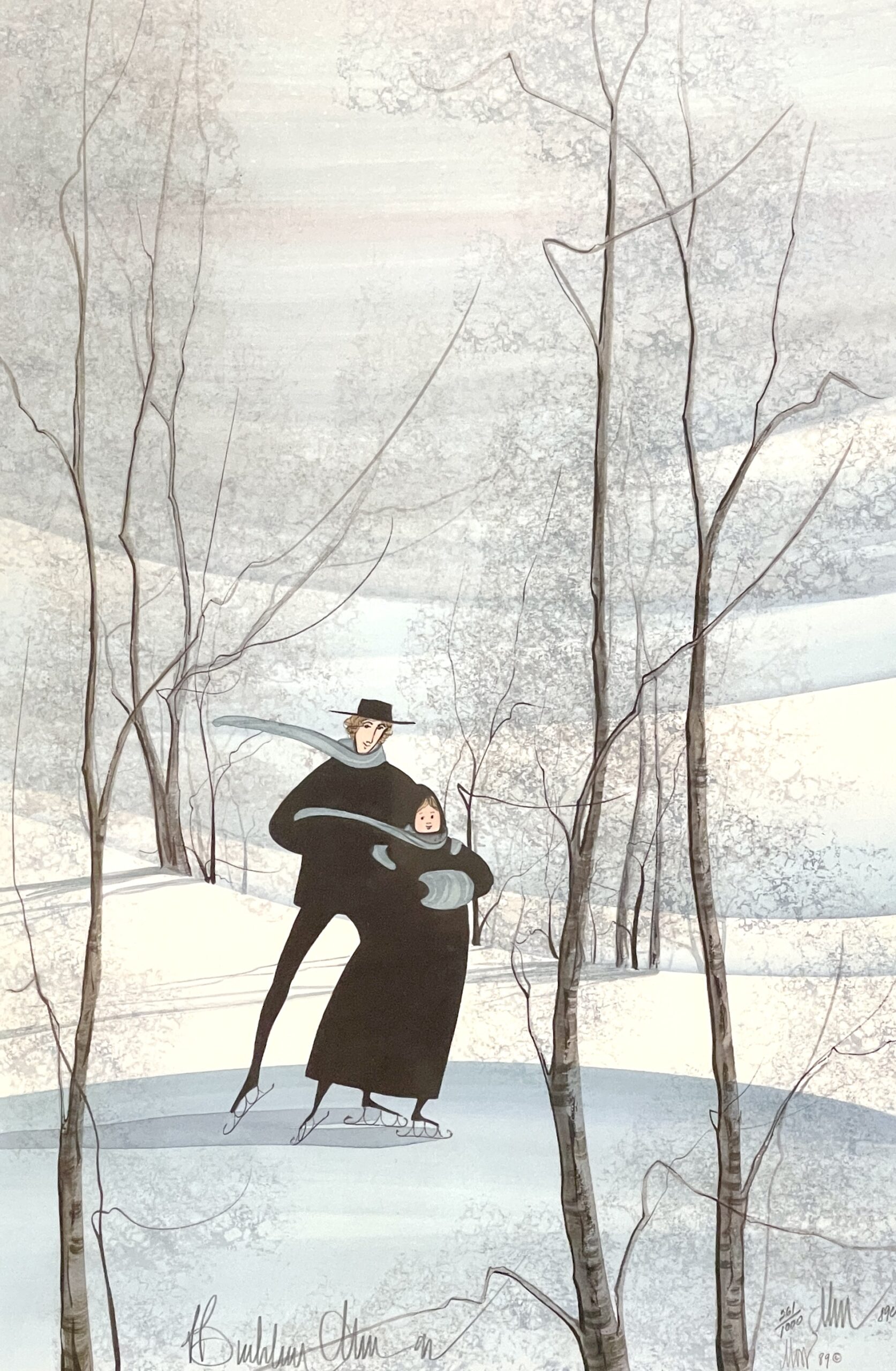 The lithograph technique preserves Moss’s delicate line work and tonal transitions, allowing the textures of snow, fabric, and trees to remain subtle yet expressive. The vertical composition enhances the feeling of upward movement and balance, reinforcing the harmony suggested by the title. In Skating Harmony, every line and color choice supports the emotional stillness and grace of the scene.