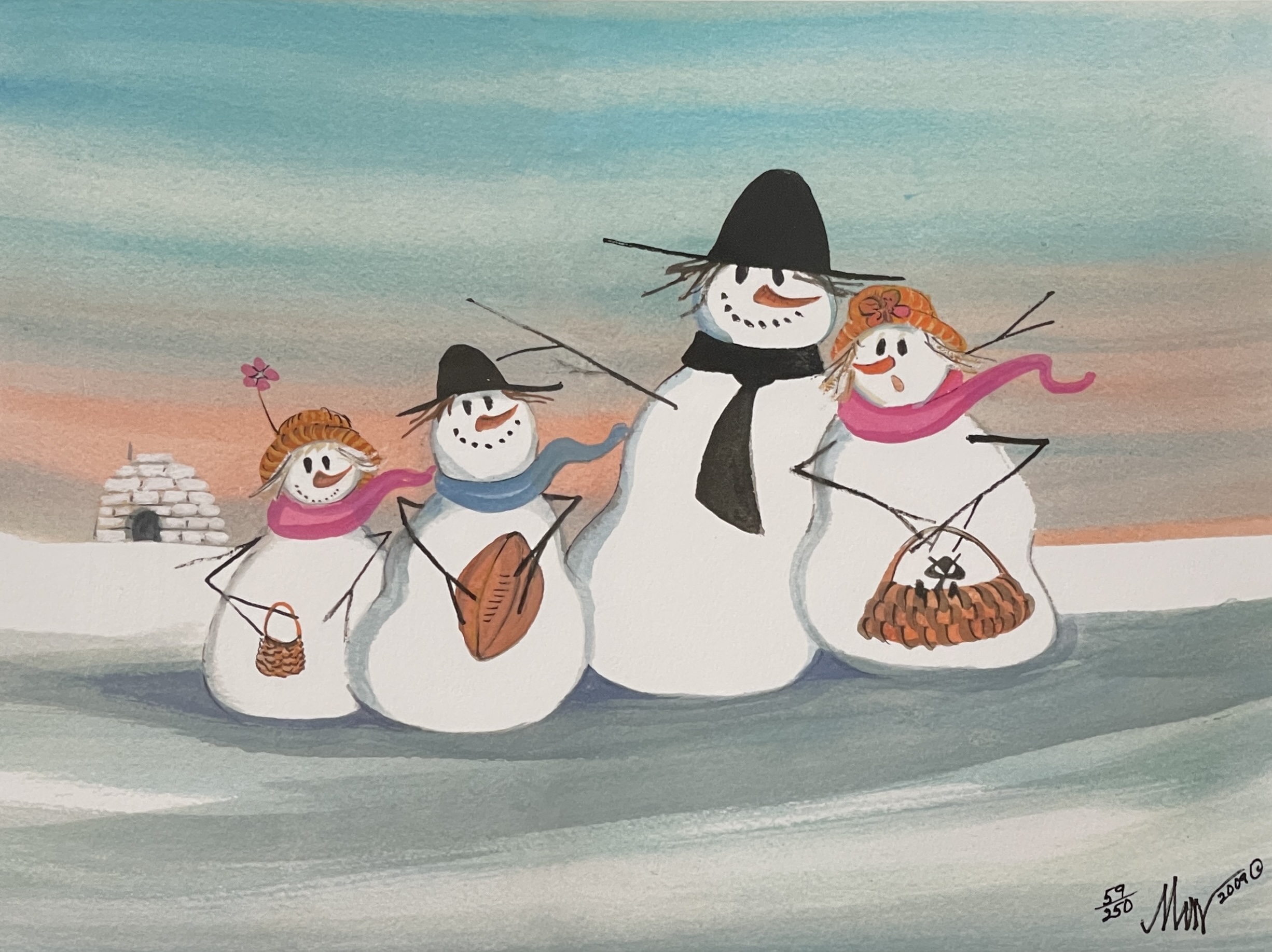 P. Buckley Moss’s snowmen are among her most collected seasonal subjects, each one uniquely expressive—often featuring charming hats, baskets, scarves, or playful objects that reflect family life and winter pastimes.