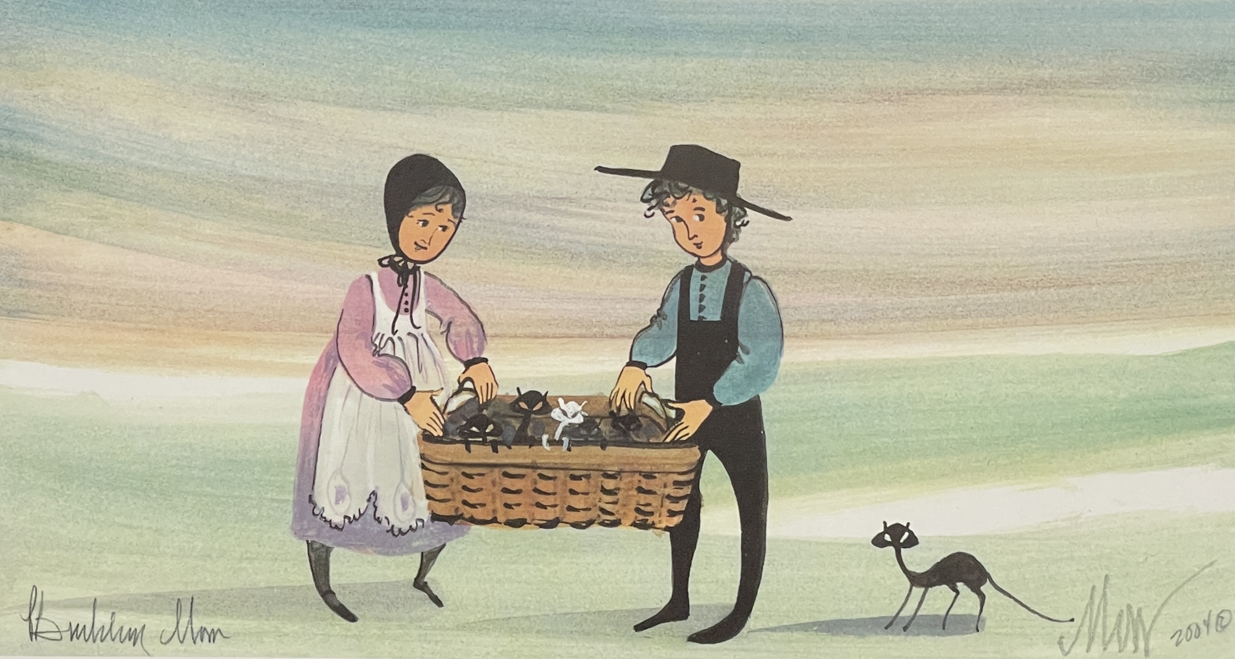 Summer Basket by P. Buckley Moss is a signed open edition lithograph from the Moss One Boy One Girl Collection, a series that beautifully captures the innocence and quiet charm of country life. This rare edition portrays a young Amish boy and girl working together, carefully carrying a large basket filled with playful black kittens — and one spirited white kitten that stands out as the centerpiece of the scene.