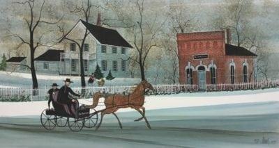 In The Doctor’s Office Artist Proof, a horse-drawn carriage moves steadily along a snow-covered road, carrying passengers through a peaceful winter setting. The figures sit closely together, wrapped against the chill, suggesting both companionship and purpose—perhaps traveling to or from a visit to the town’s physician. The horse, captured mid-stride, adds motion and vitality to the otherwise tranquil scene.