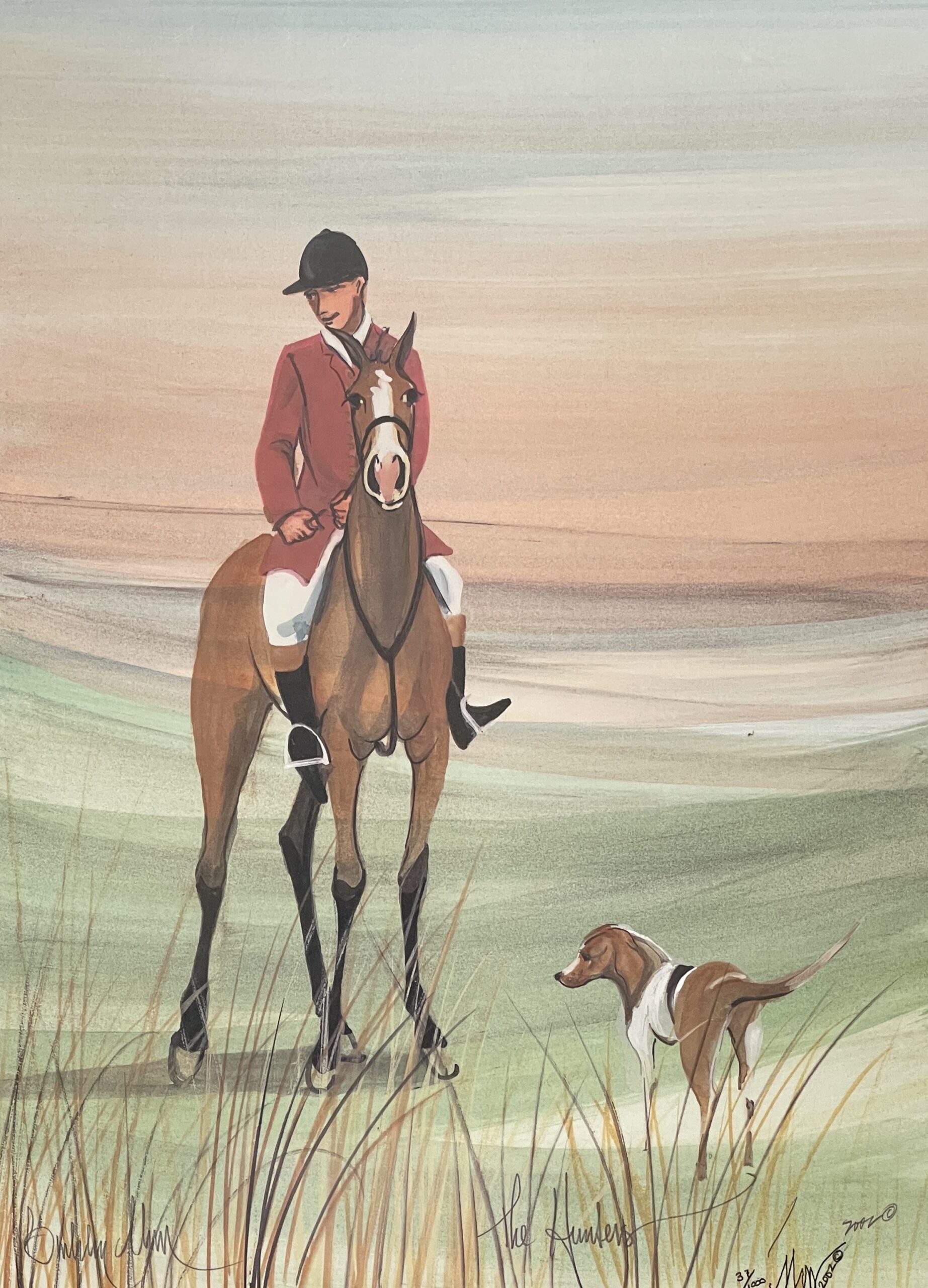 In this serene equestrian scene, a rider clad in a classic red fox-hunting coat sits tall upon a chestnut steed, accompanied by a loyal hound at his side. Soft bands of peach, lavender, and sage sweep across the sky and rolling fields in the distance, while the foreground’s golden grasses lend warmth and depth. The interplay of earthy browns and muted greens creates an inviting pastoral atmosphere that draws viewers into the countryside tableau.