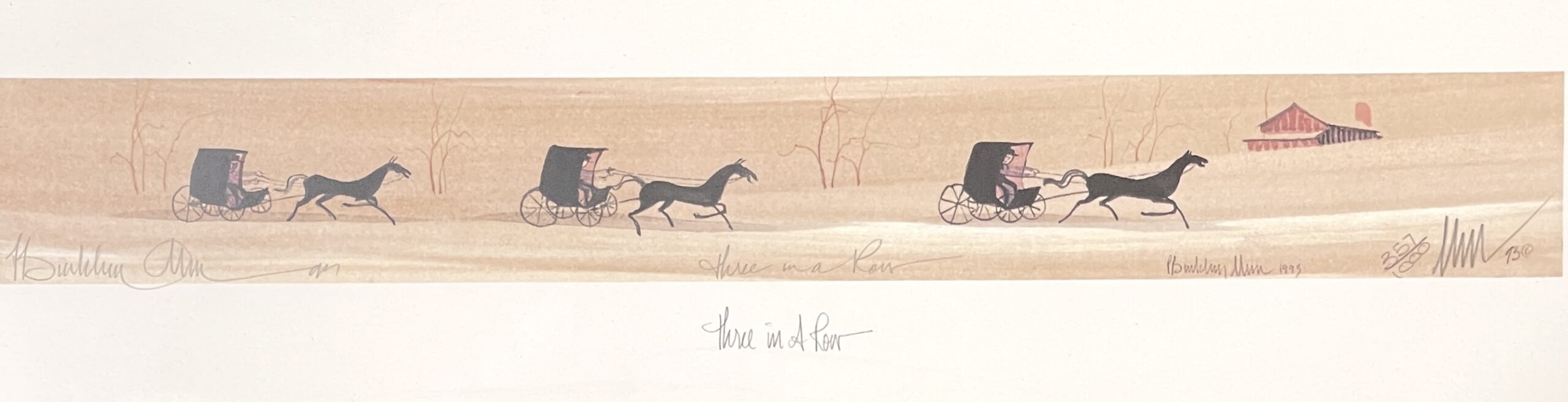 Rendered as a limited, numbered lithograph, Three In A Row showcases Moss’s signature American folk art style, defined by elongated forms, balanced compositions, and a warm, muted color palette. The soft earth tones—beiges, warm taupes, and subtle blushes—create a tranquil backdrop that allows the bold silhouettes of the horses and buggies to stand out dramatically.