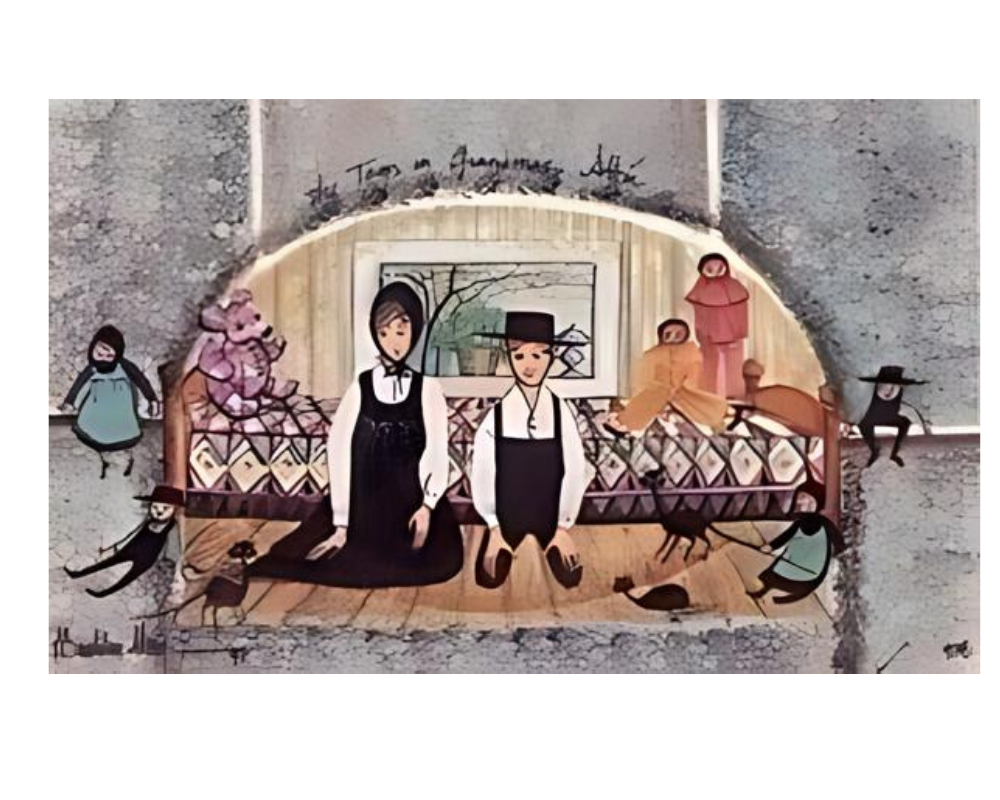 Moss’s unique folk-art style brings charm and warmth to the piece, with her signature muted colors and simplified forms adding a gentle, dreamlike quality. The soft textures and subtle details create a sense of timelessness, allowing the viewer to feel as if they are stepping back in time. The children’s expressions convey curiosity and joy, evoking the magic of discovery that only an attic filled with old treasures can inspire. Each toy seems to have its own personality and history, from the dolls perched on the bed to the tiny animals scattered on the floor.