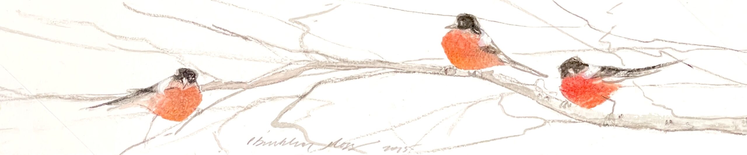Troika Painting features three small songbirds with bright orange-red breasts perched delicately along slender winter branches. Their placement creates a natural rhythm, evoking both balance and movement, while their vivid color provides a striking contrast to the softly muted background. Like the musical and equestrian term “troika,” meaning “a set of three,” this painting celebrates the beauty of unity and companionship.