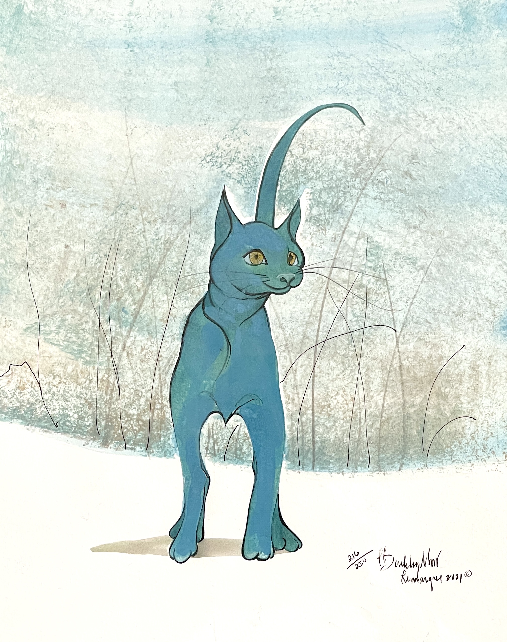 In Turquoise Treasure Remarque, a striking turquoise cat stands poised against a softly textured winter-like background. Its golden eyes glow with quiet intelligence and curiosity, drawing the viewer instantly into its world. The cat’s elongated, graceful form is both whimsical and refined, with a tail arched high in confidence.
