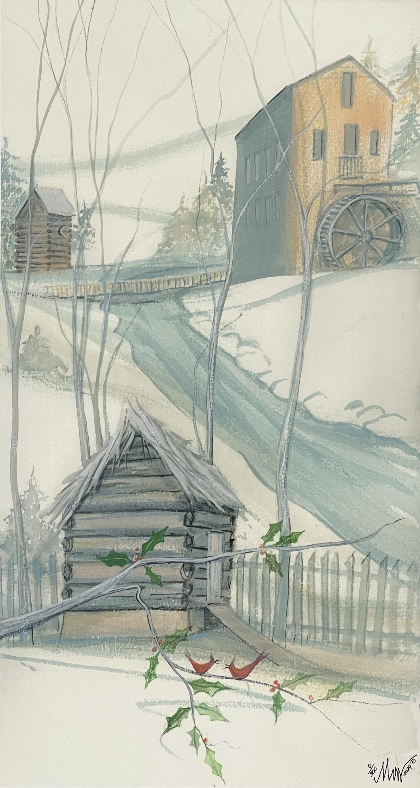 In the foreground of Winter At Wolf Creek Mill, a small log cabin rests quietly among bare winter trees, evoking early pioneer life and self-sufficiency. Delicate holly branches and two small red birds add subtle warmth and color, reminding the viewer that life endures even in the quietest season. Throughout Winter At Wolf Creek Mill, Moss weaves history, nature, and nostalgia into a scene that feels both personal and timeless.